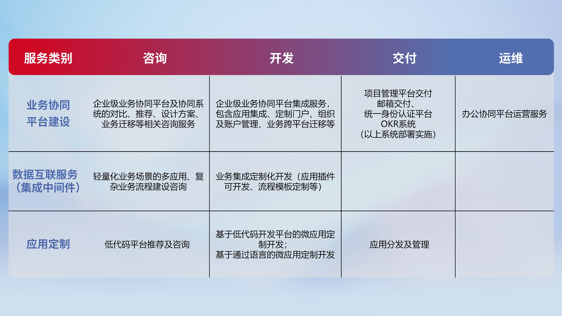 针对钉钉、、企微、、、IDaas等平台级产品提供产品的规划、、、方案、、交付、、定制化开发等服务,,,实现如统一协同办公、、、智能客户服务、、、混合会议管理、、智能数据查询、、等业务场景,,,实现数字化转型。。